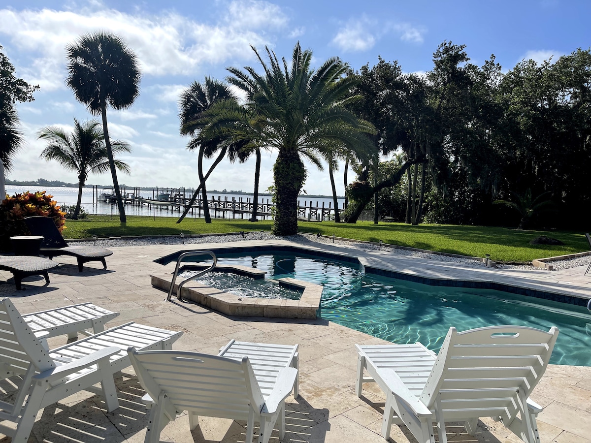 Rental space is private, downstairs only. Owner lives on-site in a separate upstairs unit. The house is configured as a duplex. The entire home is newly remodeled. Vintage mid-century modern, laid back cumfy beach style home. One short block walk to the beach, located riverfront with a pool in the backyard. Pool is gas heated upon request for a nominal charge. Private dock. 3 bedrooms, 2 bath. 2 w queen bed, 1 with 2 twins. There is a fourth bed in the den upon request please
