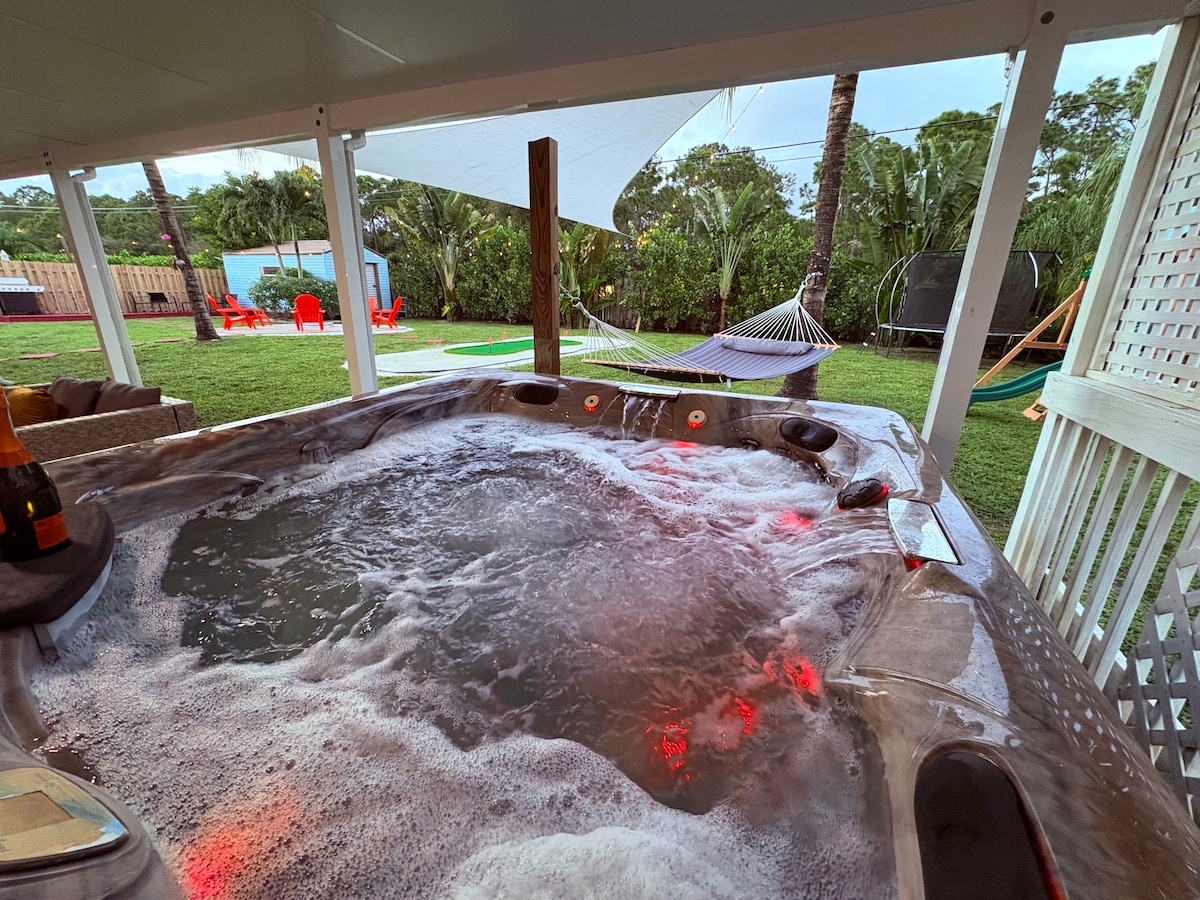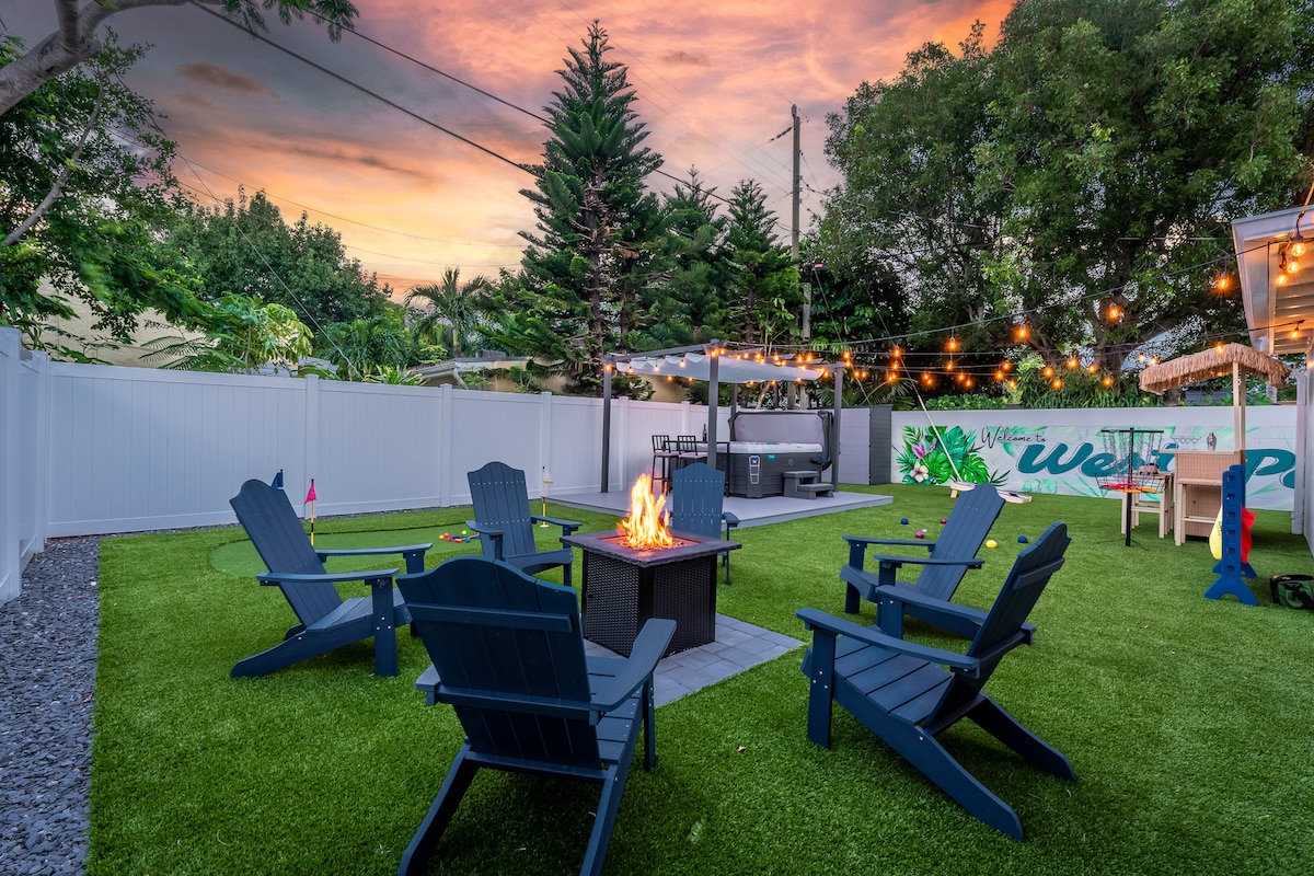 Come for the beach—stay for the backyard. This West Palm retreat feels like your own private resort, complete with mini golf, a hot tub under string lights, fire pit lounge, tiki bar, and lawn games that keep everyone entertained. Inside, the fun continues with a dedicated arcade room featuring Pac-Man, Golden Tee, and Nintendo Switch. Just 10 minutes to the beach and Downtown, and blocks from The Park golf course, you’re perfectly positioned for both relaxation and play.