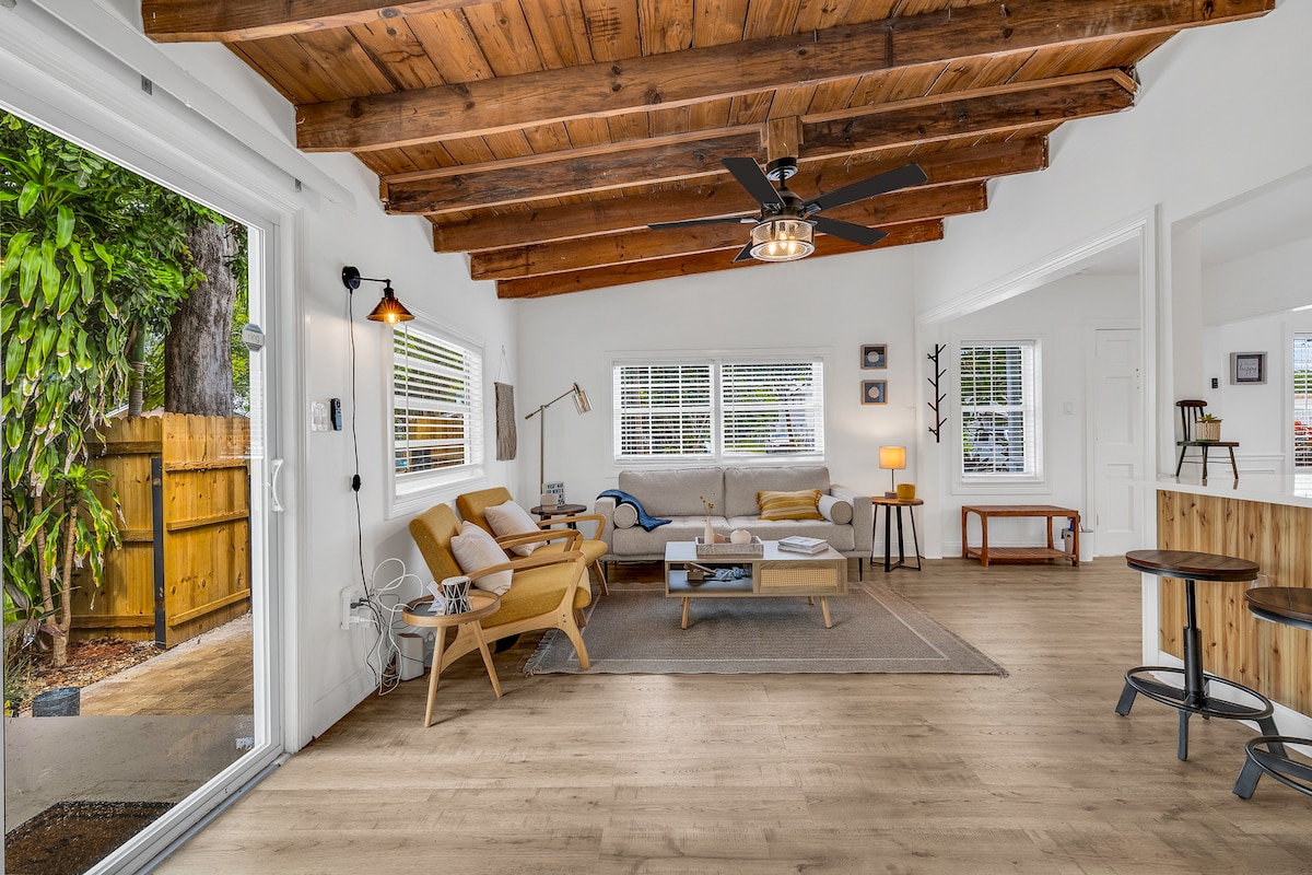 Get cozy in this centrally-located cottage. Located just minutes from beaches, Downtown West Palm Beach, the airport, zoo, science museum and more. With a fully fenced in yard you can feel at ease letting your four-legged friend roam about while you sip your morning coffee on the front patio or soak up some sun in the hammock. Enjoy fast free WiFi, smart tvs in both the living and bed room, a large walk-in closet, spacious stand-up shower and provided beach essentials.
