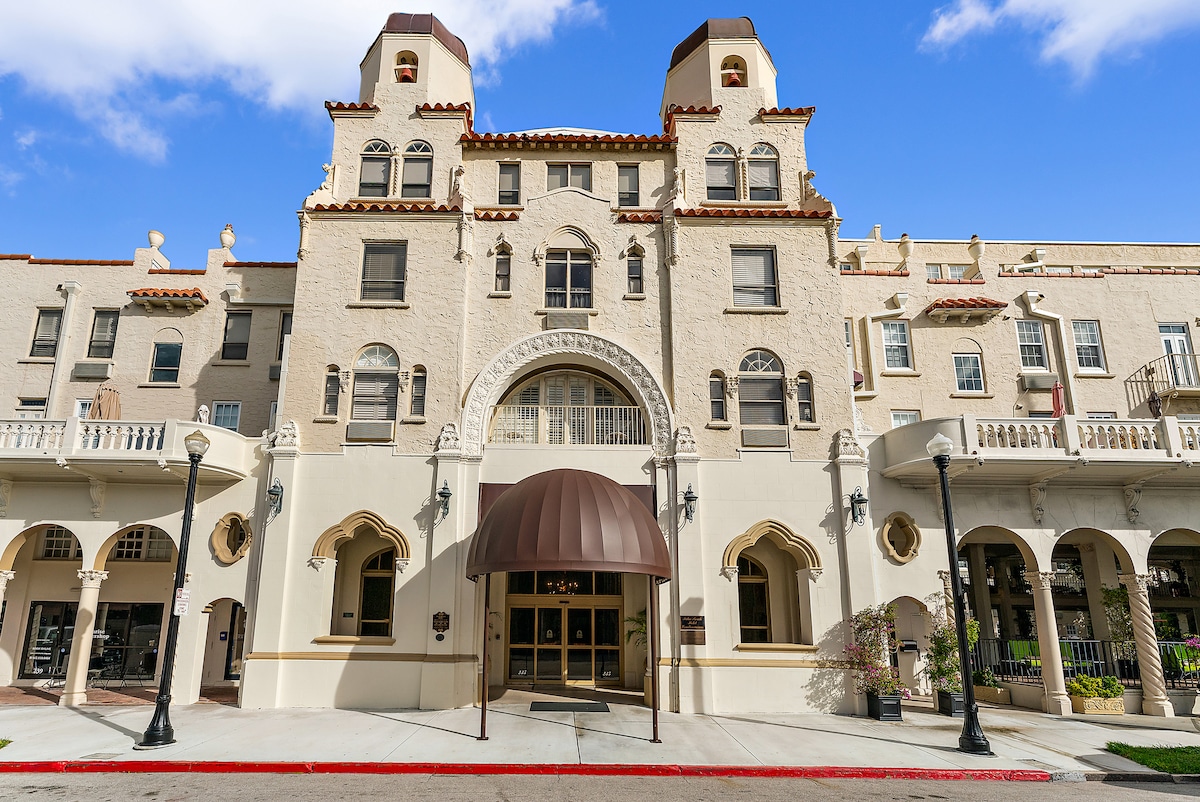 🌴🏖Beautiful remodeled Palm beach island garden/pool view 275 sf. studio available in the historic Palm Beach Hotel 2.5 blocks to the Beach. Includes a parking pass for free parking nearby. Newly furnished with large comfortable King Simmons Beauty Rest Platinum bed kitchen and a great view of a garden and partial view of the pool! Dining, bars & beach within 2 blocks and a Publix across the street, beautiful pool on-site. Parking passes are included with your stay🏖🌴
