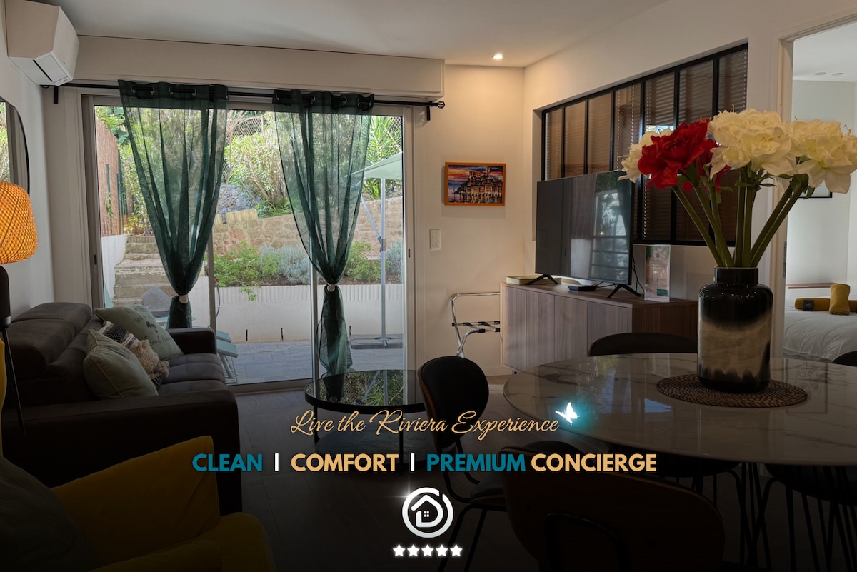 Appartement haut de gamme refait à neuf JUSTE DEVANT LA PLAGE, à seulement 10 SECONDES à pied de la plage, en plein CANNES. PALM BEACH Living room avec baies vitrées ouvrant sur TERRASSE en rez de JARDIN PRIVÉ rien que pour vous 2 chambres confortables. 2 douches 2 wc. Chauffé, clim Équipement de qualité. Fibre Quartier STATIONNEMENT GRATUIT. Bus station COMMERCES RESTAURANTS Dans CANNES quartier chic et touristique Croisette PALM BEACH PANIER PETIT-DÉJEUNER et les FRAIS DE MÉNAGE OFFERTS.
