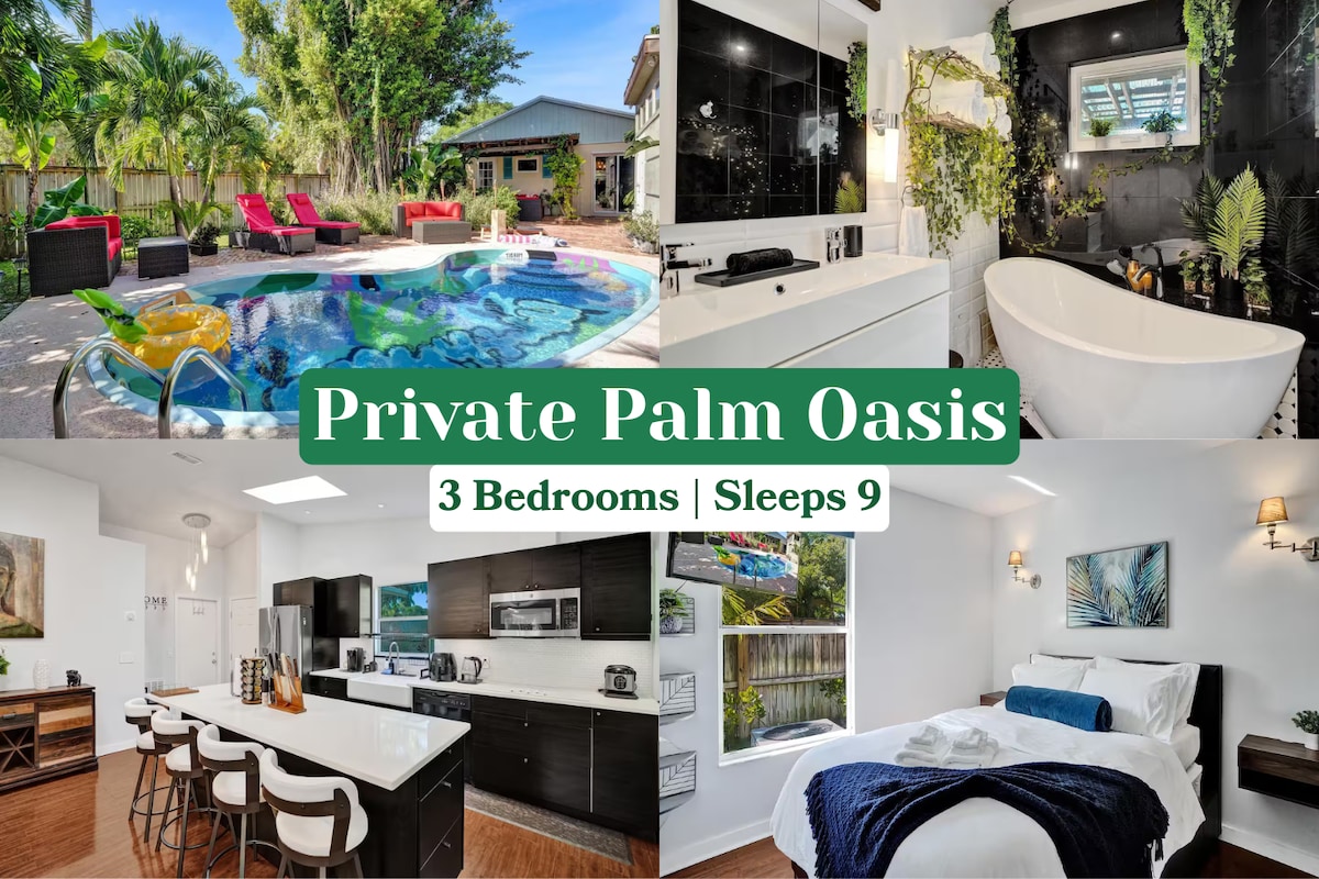 Unwind in your private heated pool after a day of exploring Palm Beach. Relax on the patio while dinner sizzles on the grill and friends compete in a game of mini putt golf or corn hole toss. What you’ll enjoy: 2 comfy bedrooms with hotel-quality linens Full kitchen & fast Wi-Fi for work or play Patio seating, yard games & free parking Minutes to beaches, golf and dining—everything you need for an effortless getaway. Book your dates before they’re gone!