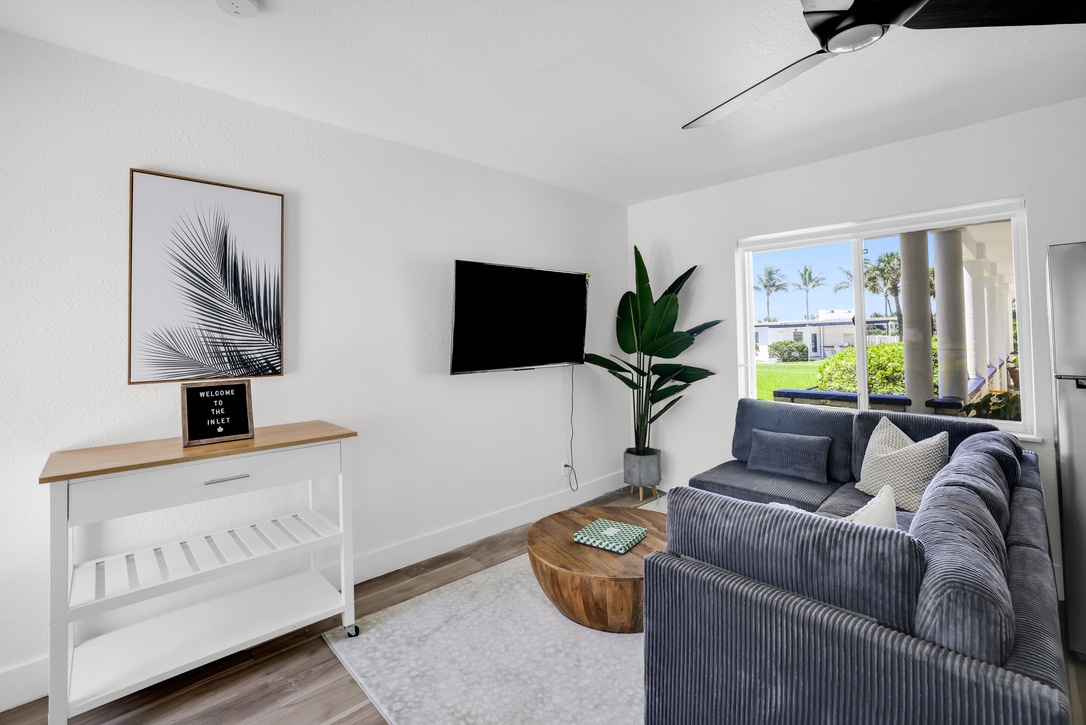 Super CUTE coastal condo across the street from the OCEAN in highly desirable Palm Beach Shores! Newly furnished 2/2 condo with cool coastal vibe. Grab a board and catch some waves or just open your window and catch the cool ocean breeze. Short stroll to uncrowded beaches, the inlet, fishing holes, some of the best scuba diving, No car walk/bike path. Popular sailfish marina and restaurants. King size mattresses in both bedrooms.