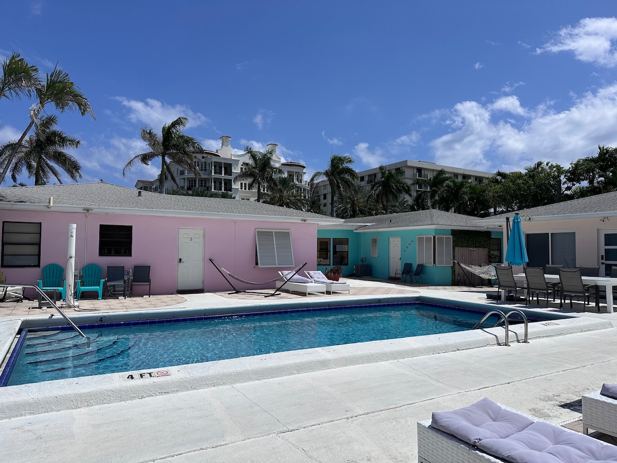 Privately-owned & gated property with six 2BR bungalow suites. Newly built 5-Star destination in downtown Singer Island near the Ritz. Walk to Florida's famous beaches. Enjoy bars, parks, marinas, reefs & more. Bermuda-style single-story fully-furnished suites feature high-end custom finishes, fully-equipped kitchen with W/D, quartz-counters, high-ceilings, s/steel appliances, double-sink vanities, plush mattresses, porcelain tiles. Saltwater heated pool & spa by sprawling palms & lush tropics.