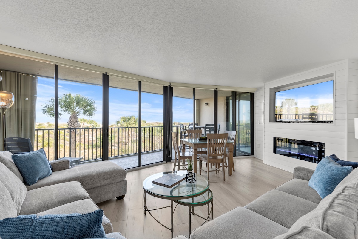 BEST spot to watch the sunrise, (and moonrise) on St Augustine Beach from every room in the condo and from the two direct beach front balconies! CORNER UNIT! TOP FLOOR! One balcony off the upstairs corner primary bedroom suite, walk in closet and ocean view King size beds in each bedroom. Anytime is a good time to be on the beach in St. Augustine! Winter Spring, Summer, or Fall! Besides being steps from the beach there are plenty of local eateries,great food, live music within walking distance.
