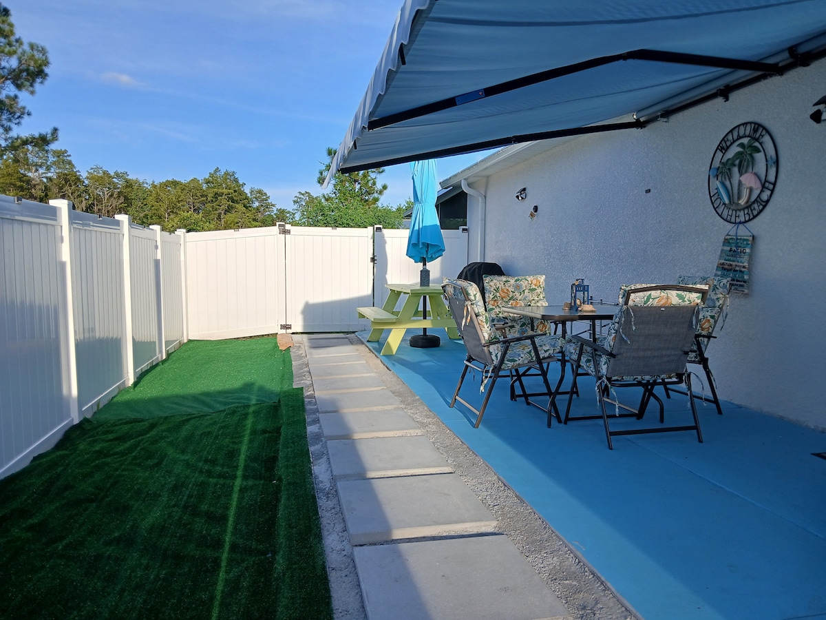 Welcome to Palm Coast Serenity. Just a short drive from the sun-kissed shores of Flagler Beach, our cozy retreat offers the perfect blend of old Florida charm and peaceful, laid-back living. Located in a quiet cul-de-sac, your space features a private patio, no shared spaces, just your own slice of tranquility. Enjoy a casual round of mini golf, unwind, or take a stroll through our backyard oasis. We look forward to welcoming you and sharing the charm of our corner of Flagler County.