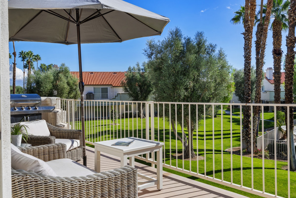 带家具的露台+度假村泳池:棕榈沙漠公寓