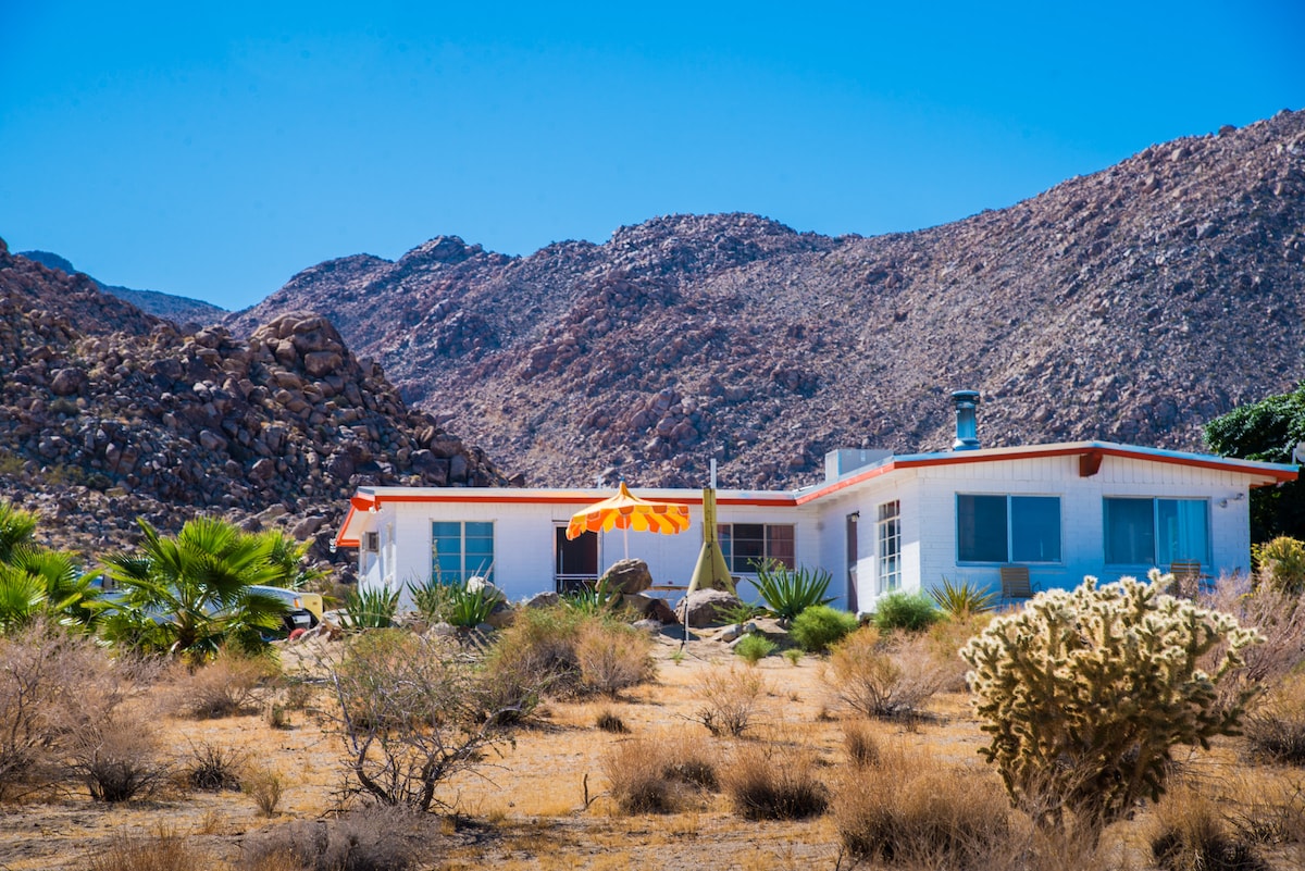 Discover La Luna Cabin, a vintage-chic 2BR desert retreat on 5 wild acres near Joshua Tree National Park. Soak under starry skies in the outdoor clawfoot bath, unwind on the porch with endless desert views, and enjoy retro-modern charm inside. Fully stocked kitchen, outdoor dining, washer/dryer, and vibrant art nearby. Just 5 min to Yucca shops, 10 min to Downtown Joshua Tree, and 15 minutes to the National Park. Wild beauty and cozy comforts await!
