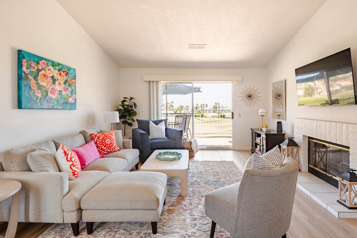Close to Coachella/Stagecoach/ACRISURE - This spacious , street-level 2 BR/2 bathroom condo comes with a Gameroom complete with ping-pong & library. A view to the fairway of the Challenge Golf Course & you are steps away from a swimming pool and hot tub. Centrally located in Palm Desert, 20mins from Palm Springs, Coachella and 45mins from Joshua Tree. An indoor fireplace, BBQ on the patio, mountain views and palm trees for days makes this a perfect respite from the hustle and bustle.
