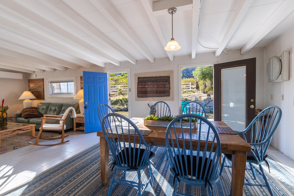Experience fall at Hidden Passage, the only vacation rental within the stunning Sand to Snow National Monument. Muse cottage at Hidden Passage is an original mid-century “jackrabbit” homestead cottage, modernized with the addition of an indoor/outdoor bathroom with slipper tub, barn windows, outdoor shower, AC, WiFi, Smart TV and more. A large studio space with kitchenette (mini-fridge, cooktop and microwave), Muse retains its old world rustic ambiance and character. Bring your dog!!