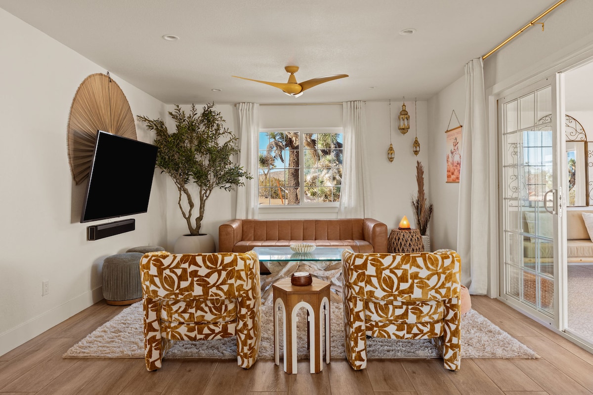 Escape to Dreamcatcher Hideaway, a stylish 2-bedroom, 2-bathroom bungalow in the heart of downtown Joshua Tree. Just a half-mile from vibrant shops, restaurants, and cafés, and only 5 miles from Joshua Tree National Park’s west entrance, this modern retreat blends desert serenity with urban convenience.   Unwind in a light-filled home featuring a gourmet kitchen, home theater, hot tub, plunge tubs, outdoor dining, propane grill, fire pit, hammock, and a Level 2 EV charger.