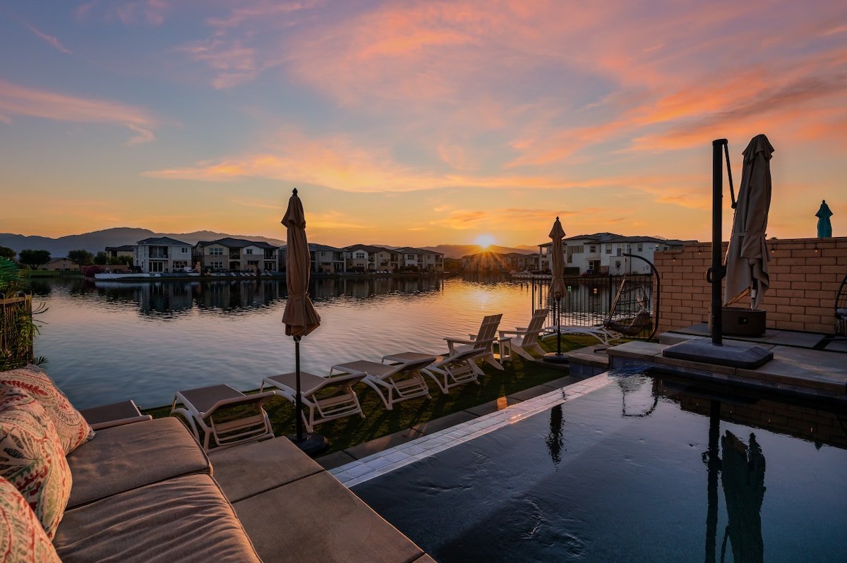 Welcome to Serenity Shores, an luxury 4-bedroom, 2-story home overlooking the picturesque lakes of Terra Lago. Unwind in sun-kissed infinity pool with FREE POOL HEAT and incredible mountain views. Relax by the fire pit or cook up a meal in our outdoor grill. Inside there's a fully stocked kitchen, massive 4K TV, foosball table, board games, and more! With every convenience at your fingertips, Serenity Shores promises an calming, unparalleled experience of relaxation and sophistication.