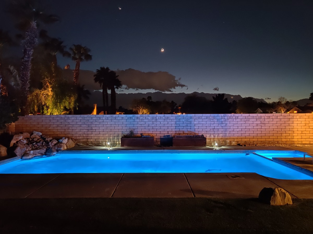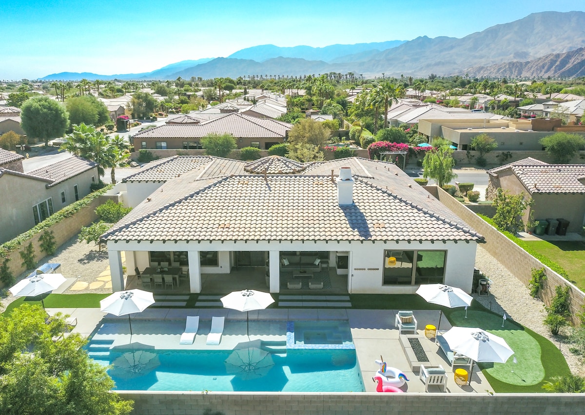 Huge (20'x40') heated/cooled salt-pool/spa with tanning deck/basketball hoop. Putting green/fire pit in huge backyard (0.32 acre) surrounded by unobstructed mountain views. Big patio w/dinning table for 10, 6 burner bbq grill/pingpong/cornhole. Airhockey/Foosball/65" TV w/ YoutubeTV/Netflix/Disney+. A fully-stocked gourmet kitchen, purified water, Nespresso machine. Hotel-style amenities. Close to all stores, restaurants, Tennis and Coachella. No party allowed. LIC-067667