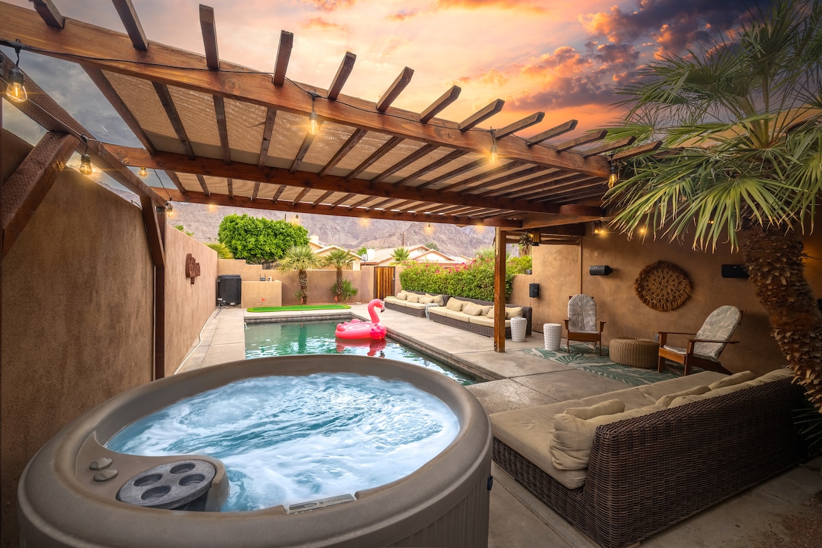 Nestled against the backdrop of the beautiful San Jacinto mountains, our retreat offers a luxury getaway surrounded by palm trees and clear blue skies in the heart of the Coachella Valley. Conveniently located near Palm Springs, Acrisure Arena, Joshua Tree, Indian Wells Tennis Garden, PGA West Stadium Course, El Paseo Shopping District, Agua Caliente Casino, and Empire Polo Club. This sanctuary provides quick and central access to the vast desert wonders and surrounding city experiences.