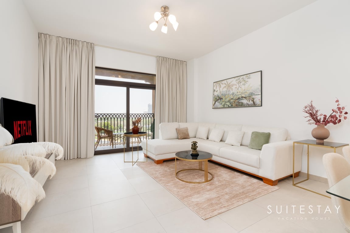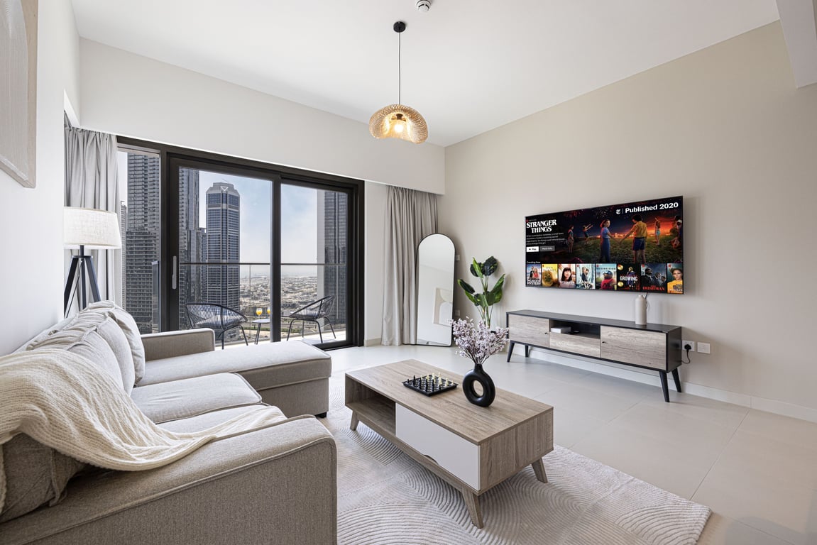 Experience a chic one-bedroom apartment in La Sirène, Port de La Mer, Dubai, blending Scandinavian design with coastal charm. Furnished in soft beige, white, and light blue hues, it boasts a full view of Burj Khalifa and the Dubai skyline. Perfect for New Year’s or fireworks events, this tranquil retreat offers unmatched luxury and unforgettable moments.