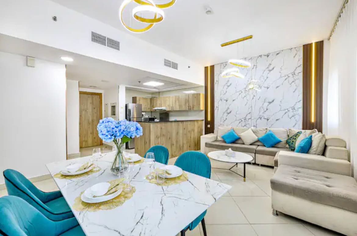 Right near Intercontinental Marina Hotel (less than a minute away), peaceful, centrally-located apartment (42 sqm size) at the heart of Marina with a full view of Marina bay and partial view of the beach. It’s 5minutes walk from the tramway station and JBR walk and is 10minutes walk from the famous JBR beach as well as Dubai Marina mall. You have restaurants, supermarkets and pharmacies downstairs all of which can deliver to your doorstep.