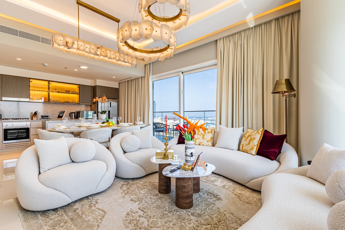 Experience beachfront living at Grand Bleu Tower on Dubai’s exclusive Emaar Beachfront. This stylish 1BR offers breathtaking views of the Atlantis, Palm Jumeirah and Arabian Sea — stunning by day, mesmerizing at sunset, and sparkling at night. Unwind by the infinity pool, relax on the private beach, or enjoy the calm from your balcony. Designed for comfort and elegance, it’s the perfect setting for an unforgettable Dubai stay.