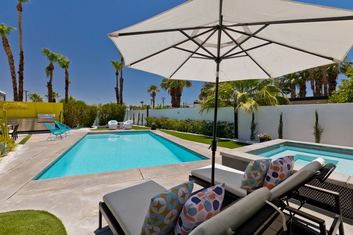 双棕榈中世纪风格,带私人泳池/水疗和景观