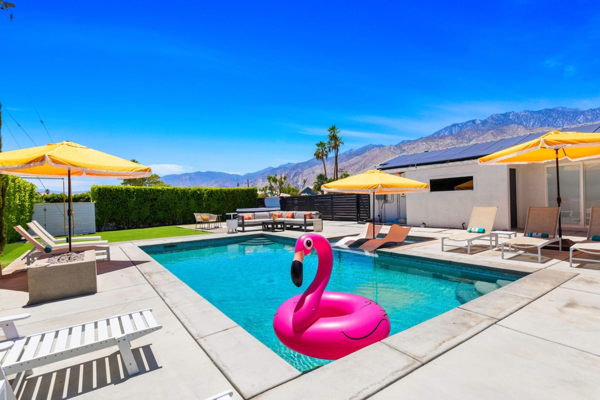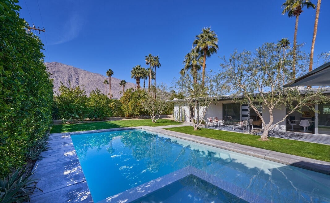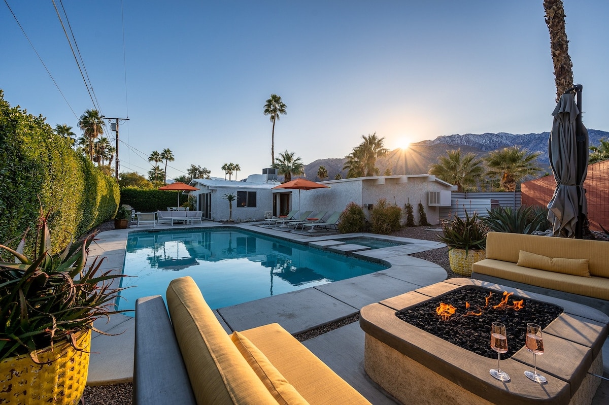 This Private resort style yard and breathtaking mid-century modern interior provide the complete Palm Springs experience! The back yard has just been completely renovated to a fresh clean resort vibe with heated pool and waterfall spa, tanning ledge, fire pit lounge with mountain views, gorgeous outdoor dining in the mountains shadow for sunsets and a glass of wine. The Interior features an open concept, luxury linens, organic toiletries, fireplace and everything you need to live your best life.