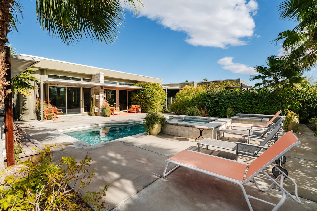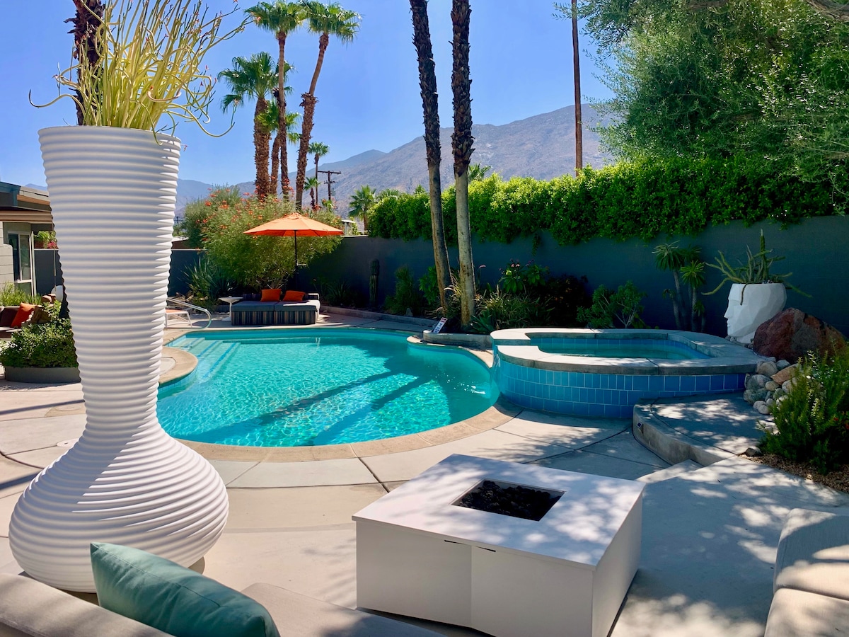The Palmetto House - A Luxury + Mid-Century Oasis with a private resort-like pool with cabana, fire-pit, hot tub & amazing views of the San Jacinto mountains located about 2 miles from Downtown Palm Springs. This mid-century modern home was designed by legendary Architect James Cioffi and offers a spacious layout and seamless flow to the pool area. High ceilings and windows let tons of natural light flow in creating an oasis both inside and outside.