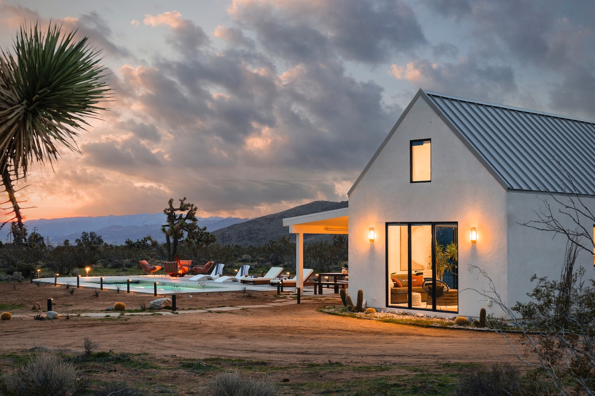 A stylish desert getaway on 4 acres in central Pioneertown, just 5 min walk to Pappy & Harriet's. Perfect for retreats, concert stays, family trips, or Natl Park adventures. ✧ Outdoor Western saloon w/ bar, piano & couch ✧ Hot tub & cowboy pool ✧ 3 bedrooms + 1 sleeping loft (2 king, 2 queen) ✧ 16' ceilings, 1600 sqft (see blueprint) ✧ Larged fenced dog yard ✧ Firepit, 3x patios, BBQ ✧ Tesla charger, fast WiFi ✧ XL indoor bathtub ✧ Hammocks Desert modern luxury meets the spirit of the west.
