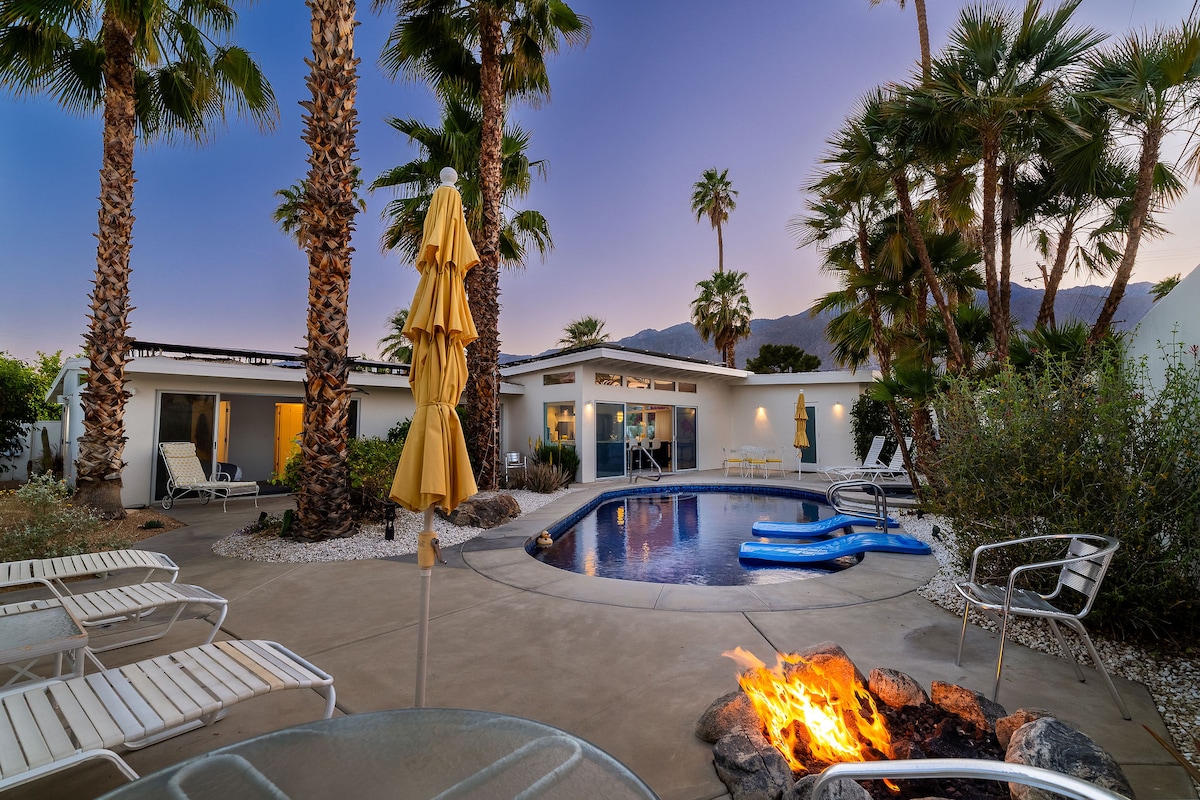 Welcome to The Mod Spot, a luxurious Palm Springs oasis. This stunning, renovated home was built in 1957 and is a true mid-century home. You will love the huge 48ft. wraparound pool, hot tub and loads of amenities! With 4 bedrooms and 3 baths, this is the perfect home for enjoying the sun-drenched lifestyle that is Palm Springs . Relax among the carob trees on one of the many poolside loungers or enjoy a fire in the outdoor living space while basking in luxury. You won't want to leave!