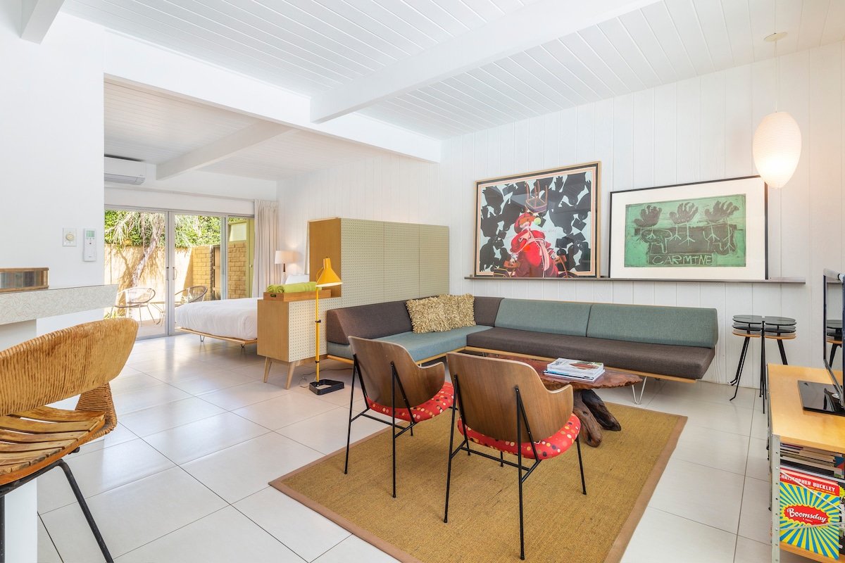Located in central Palm Springs, this adorable Midcentury Modern private guest house was built in '71 and refreshed to match our '60 house. Set-up just a like a hotel room (270 sq ft) with private entrance, patio, small fire-pit, lounge area, and private outdoor shower. There is a small kitchenette (no cooking). Great for singles & couples. Adults only. Includes access to main yard, shared pool & a new spa! LGBTQ owned/operated. Neighborhood has a remarkable collection of midcentury homes!