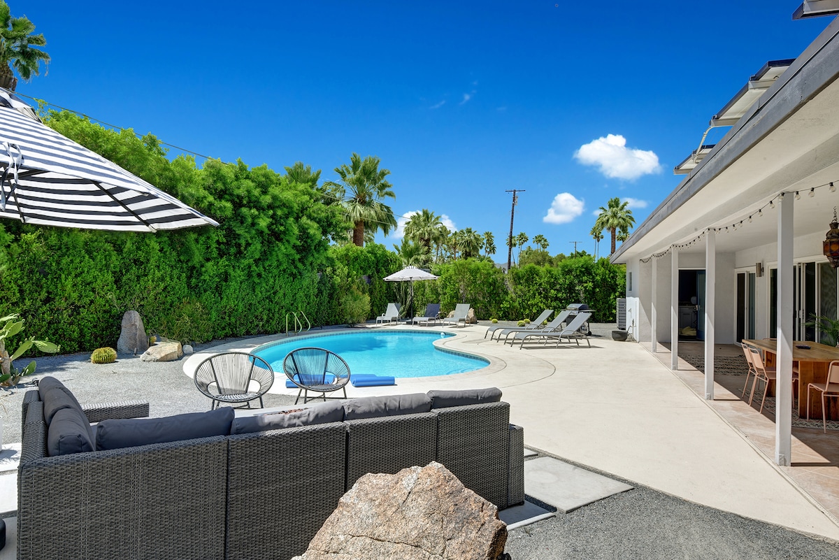 A mid century luxury open concept home with designer decor soaked in the desert sun .Relax in the oversized lush private backyard / sparkling kidney-shaped pool. The Mid Century furnishings are offset by sparkling porcelain floors , ample seating, 4 smart TV’s . Desert sunsets around the fire pit and al fresco meals at our reclaimed outdoor table. Villa Maroc is centrally located within walking distance or a 5 min drive to all our favorite restaurants. A true desert oasis...PS City ID#4400