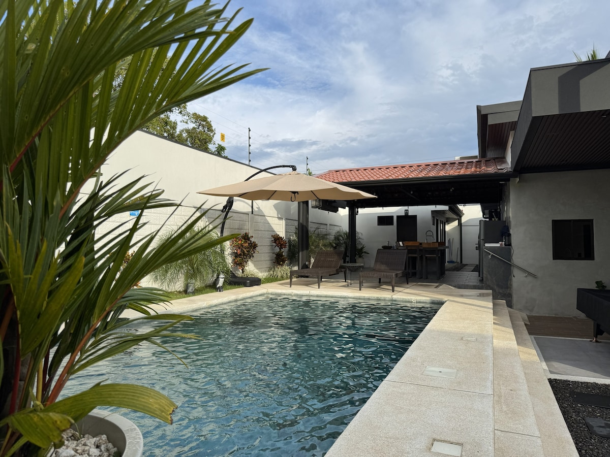 Modern suite surrounded by nature, just 2 min from famous surf beach Playa Hermosa (near Jacó). Comfortable space with 2 bedrooms (with A/C), 1 bathroom, and an outdoor covered kitchen/dining area. Relax on the terrace with garden views and spot white-faced monkeys, macaws, and toucans that visit daily. The guest suite is on the ground floor with private entrance but is part of our home where your host family lives. The fenced garden and parking are shared with us.