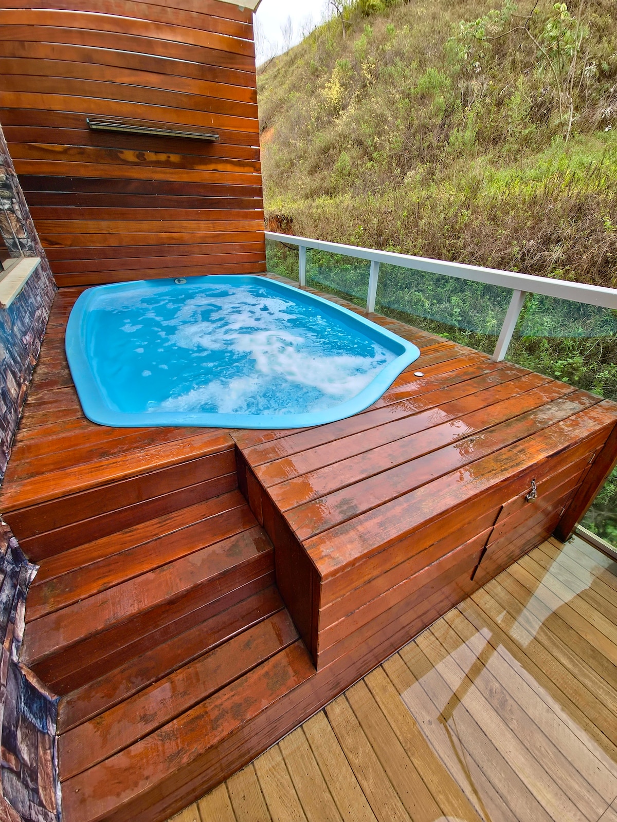 o Chalé Recanto Do Ipê Amarelo, possui piscina com hidromassagem, vista pro nascer e pôr do sol, varanda com vista incrível, pergolado e deck com churrasqueira. Lindo Jardim, bancos, balanço, rede pra descansar. Cozinha equipada com cocktop, panelas, Air frayer, forno elétrico, geladeira. wi-fi. Ótima localização, apenas 200 m de estrada de chão. Chalé todo construído com madeiras nobres. Cama de casal no quarto superior de 15m2, sofá super confortável, colchonetes. Toalhas disponíveis.