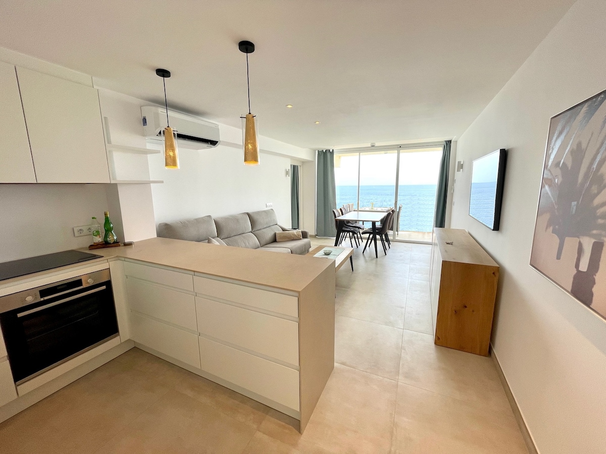 Unsere wunderschöne, neu renovierte Wohnung bietet einen grandiosen Panoramablick. Die privilegierte Lage direkt am großen Sandstrand und Yachthafen bietet eine spektakuläre Aussicht. Der freie Blick geht über den Hafen und über das offene Meer hinaus. An dem großen Esstisch können Sie morgens frühstücken und abends Ihren Sundowner genießen. Palma liegt ca. 15 Autominuten und der Flughafen 20 Minuten entfernt.