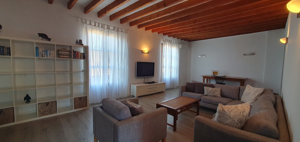 Spacious and comfortable, this apartment’s open floor plan covers over 60 sqm. Our completely renovated 19th century building has an unbeatable location in the heart of Old Town Palma, less than 15 minutes walking from the beach and the city’s main attractions, and 5 minutes from paid parking. Enjoy bustling tapas bars by day and tranquil streets at night. The apartment is on the 1st floor and the most accessible unit in the building; it’s fully equipped, including wifi and climate control.