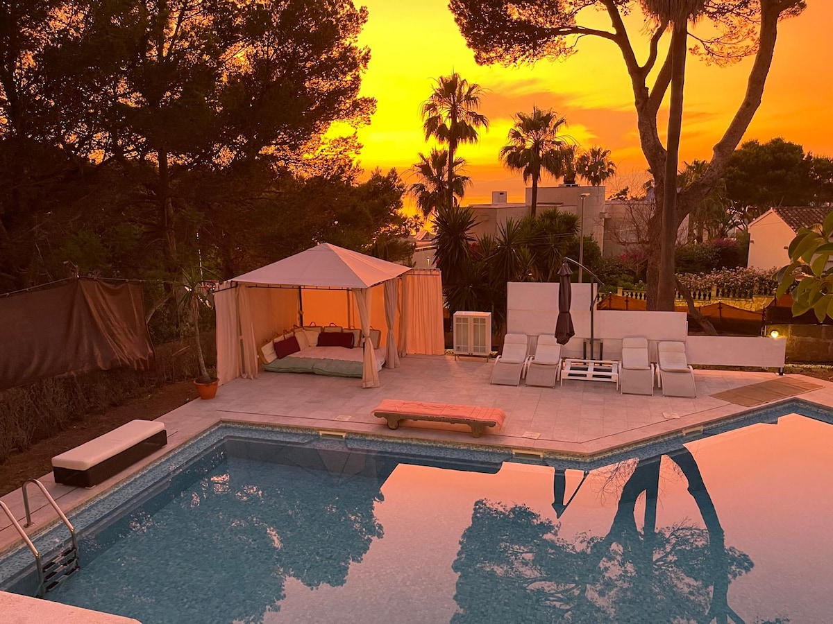 THE Location: big pool (12x6), large, tiled terraces, partly roofed, 2,000sqm land-scaped garden with sea view. Open kitchen-living room & dining areas with floor-to-ceiling sliding doors leading to the back & upper terraces. Fireplace. Modern kitchen, US-size fridge. Ideal for hen/stag parties, intimate wedding & family reunions/LS fun. 20 minutes from PMI airport and 15 minutes from Playa de Palma. Full service options available. Includes up to 4 bedrooms, 2 bathrooms & private spa/gym access.