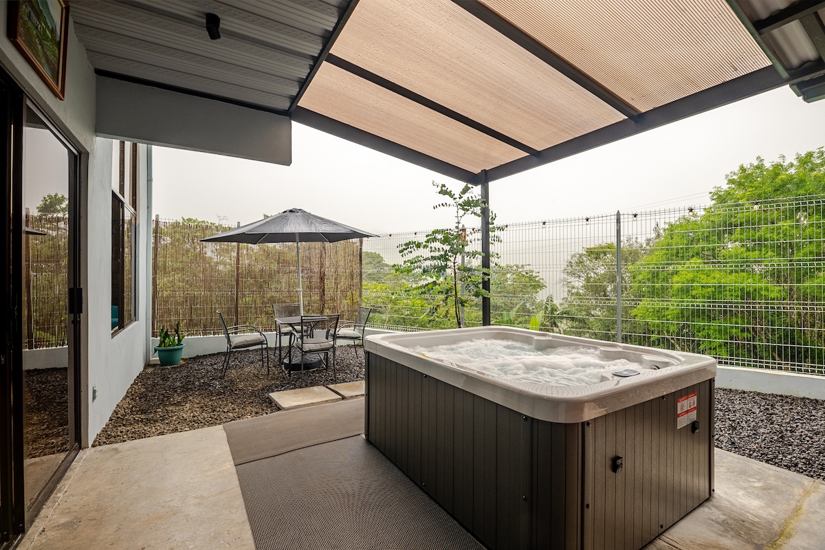 New, fully furnished house with a great view of Volcanoes and Valley! Located in a quiet community very close to Atenas downtown (4.5Km). Large master room w/ King size bed plus one guest room. Two full bathrooms. Contemporary design and decor. Large, integrated kitchen with granite countertops and all appliances. Very spacious social area with large windows and mosquitoes screens. Big terrace with deck and built-in jacuzzi. Great view all over. Service include gardener and maid (once a week).