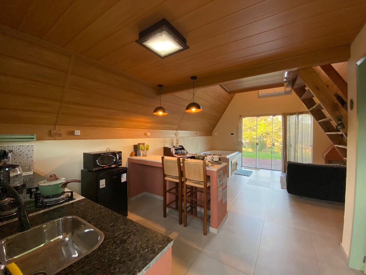 Relaxe neste espaço calmo e cheio de estilo, em meio a natureza com deck contemplativo, lindo riacho aos fundos para se banhar ou apreciar o som da água. Nossa cabana foi pensada p/ proporcionar conforto e uma experiência única para casais que querem fugir da rotina, Hidromassagem com cromoterapia p/ 2 pessoas, móveis de alto padrão e colchão QUEEN, roupas de cama de primeira linha, utensílios de cozinha, fogão e tudo que é preciso p/ passar dias perfeitos em meio a natureza. Café da manhã inc.