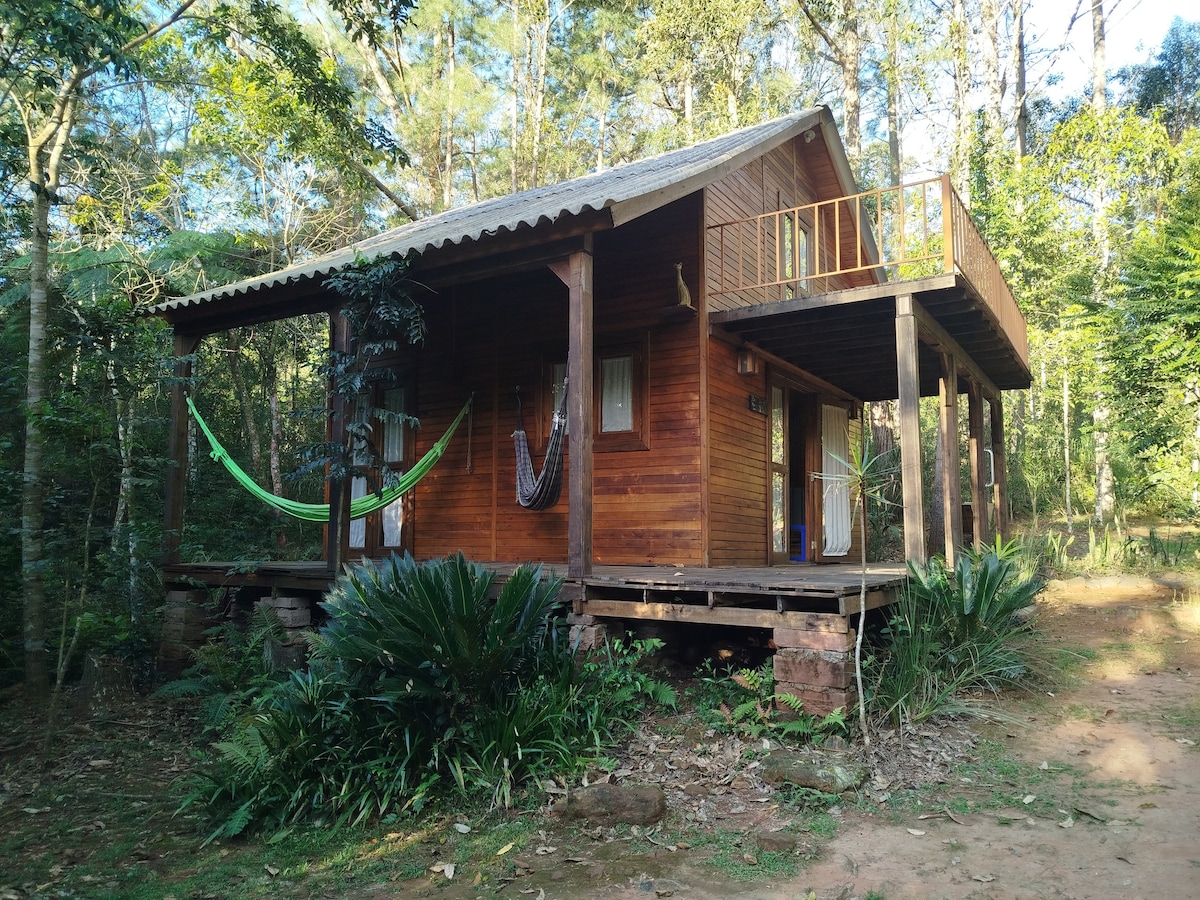 Cabana em meio à Mata Atlântica, com ótimo acesso, próxima ao mirante do Morro da Borússia! Cama de casal e cama de solteiro (quartos integrados), ar-condicionado portátil, lareira, churrasqueira externa, estacionamento descoberto e amplo pátio para desfrutar da natureza, com a presença de tucanos e outros pássaros nativos! O mirante fica a 1 minuto caminhando! Uma bela vista da cidade e da paisagem! Em dias limpos se pode ver o mar!! Próximo de mercado e do restaurante Dodô.