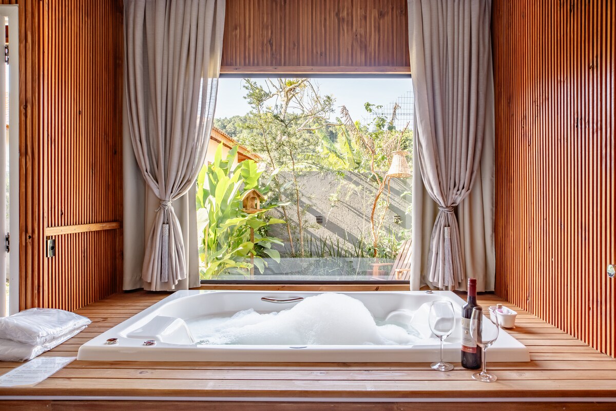 Relaxe em uma cabana exclusiva em Florianópolis com hidro privativa, jardim aconchegante e todo o clima romântico que você procura. Estamos em Vargem Pequena, no norte da ilha, perto de praias, restaurantes e pontos turísticos, mas em um cantinho reservado para garantir tranquilidade. O refúgio ideal para casais! Com a hospedagem inteira só para vocês, um ambiente privativo, silencioso e acolhedor e com a possibilidade de adicionar pacotes românticos (cobrados a parte).
