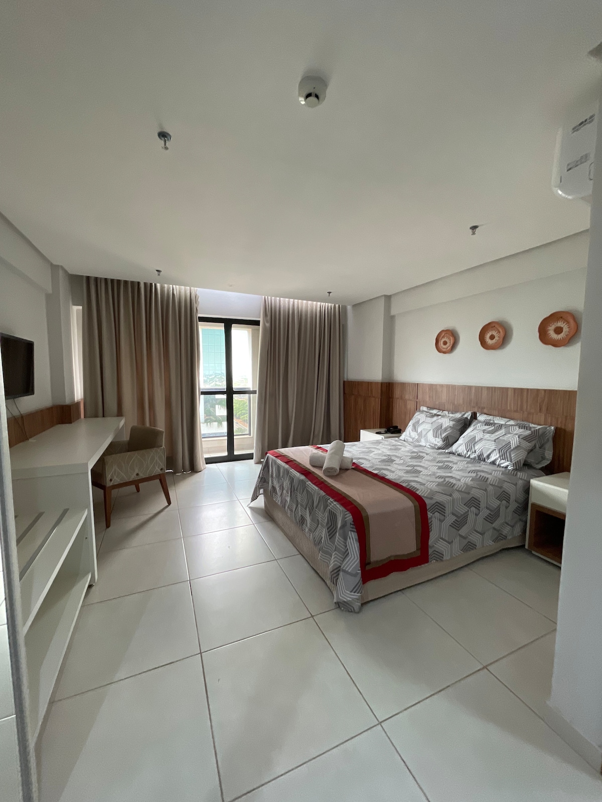 Flat espaçoso e confortável, ambiente totalmente integrado, contendo ambiente compartilhado de dormitório com rack de TV entre o quarto e sala de estar e um balcão para a cozinha no estilo americano. Ambiente perfeito para hospedagem de casais e viajantes à trabalho. O Flat acomoda até dois adultos em cama de casal Quen Size. Familias que possuem uma criança de até 12 anos podem optar por acomodada-la no sofá cama disponível na sala sob consulta e taxa adicional.