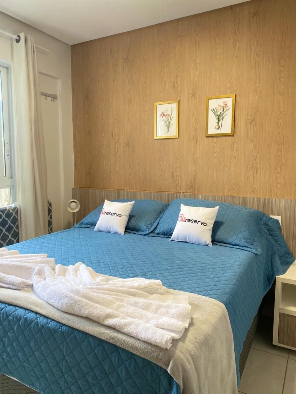 Flat espaçoso e confortável, ambiente totalmente integrado, contendo ambiente compartilhado de dormitório com rack de TV entre o quarto e sala de estar e um balcão para a cozinha no estilo americano. Ambiente perfeito para hospedagem de casais e viajantes à trabalho. O Flat acomoda até dois adultos em cama de casal Quen Size. Familias que possuem uma criança de até 12 anos podem optar por acomodada-la no sofá cama disponível na sala sob consulta e taxa adicional.