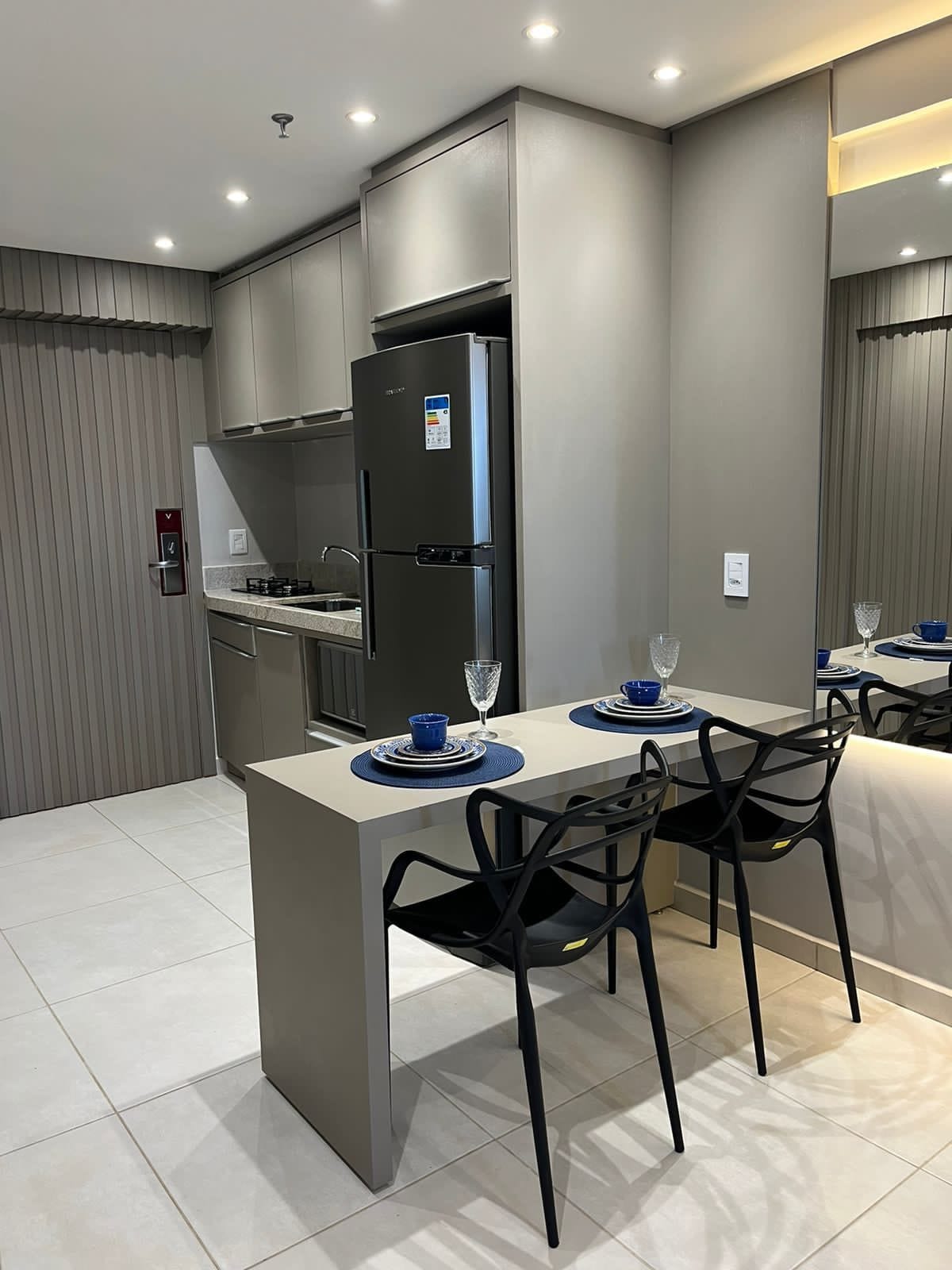 Flat espaçoso e confortável, ambiente totalmente integrado, contendo ambiente compartilhado de dormitório com rack de TV entre o quarto e sala de estar e um balcão para a cozinha no estilo americano. Ambiente perfeito para hospedagem de casais e viajantes à trabalho. O Flat acomoda até dois adultos em cama de casal Quen Size. Familias que possuem uma criança de até 12 anos podem optar por acomodada-la no sofá cama disponível na sala sob consulta e taxa adicional.