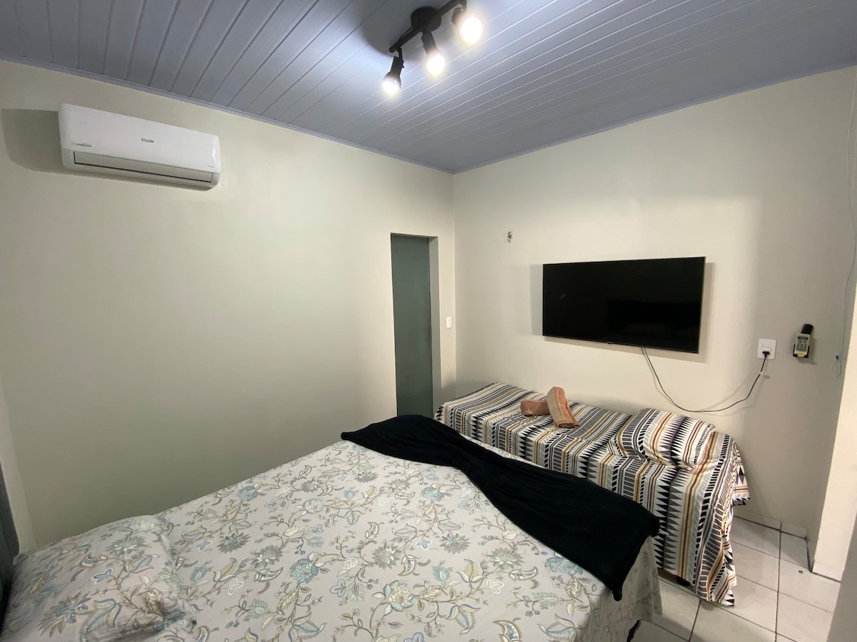 Sua família vai estar perto de tudo ao ficar neste lugar bem-localizado. 2 - Quartos; duas cama casal. 1- banheiro 1- cozinha; contendo uma geladeira, microondas, fogão, bebedouro, cafeteira, mesa, liquidificador e utensílios 1- sala; contendo um Sofa cama, uma tv, painel parede, Wi-Fi. 1- área de serviço; tanque, varal, ferro e tábua de passar roupas. 1 - um jardim acoplado com quarto No centro de uma palmas