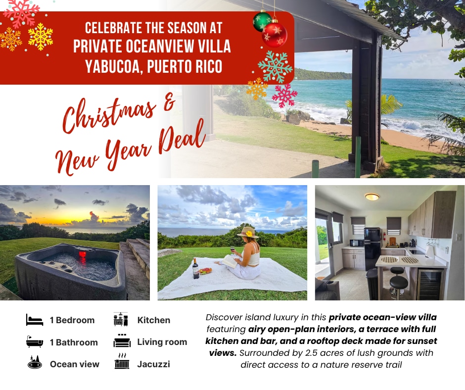 Ring in the New Year with Caribbean charm! Watch the waves, relax in your hammock, and unwind in the jacuzzi beneath a sky full of stars. Your private 1-bedroom villa offers comfort and style, featuring modern interiors, air conditioning, and easy access to beaches and local gems. Perfect for couples or honeymooners celebrating the season in tropical serenity. 🌴✨