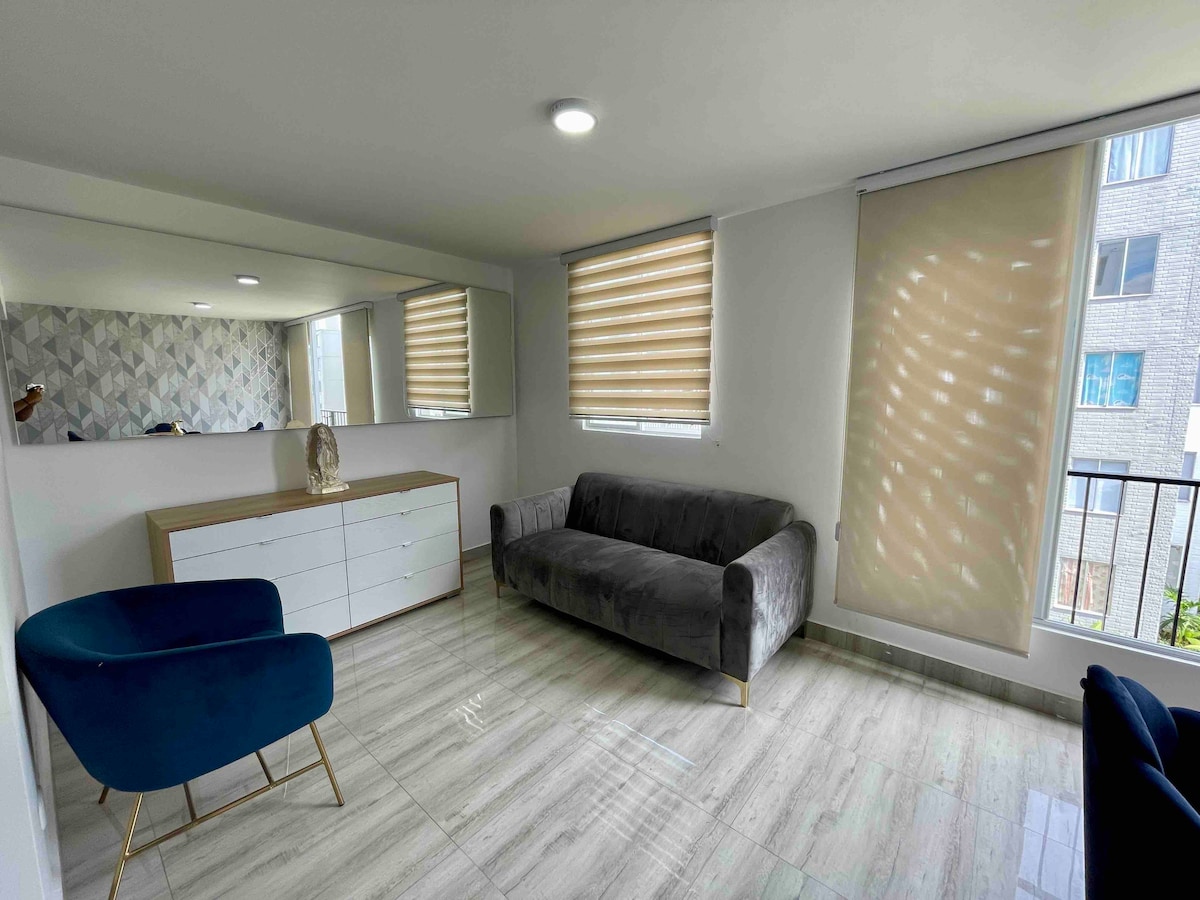 Hola buen dia, nuestro apto es 2/2 que será tu casa fuera de tu casa. RENTAS DE CORTO Y LARGO TIEMPO con A/C. A 15 Mins del Aeropuerto y al lado de UNICENTRO mall con cine y muchos lugares para comer y hacer tus compras. Cali es tu destino está a tan solo 30 mins. Tendrás todo lo que necesitas para pasar unas vacaciones adecuadas, la unidad tiene seguridad las 24/7. El apto queda en un 4to PISO y no hay elevador sorry. NO se permite FUMAR dentro del apto un paqueo disponible.