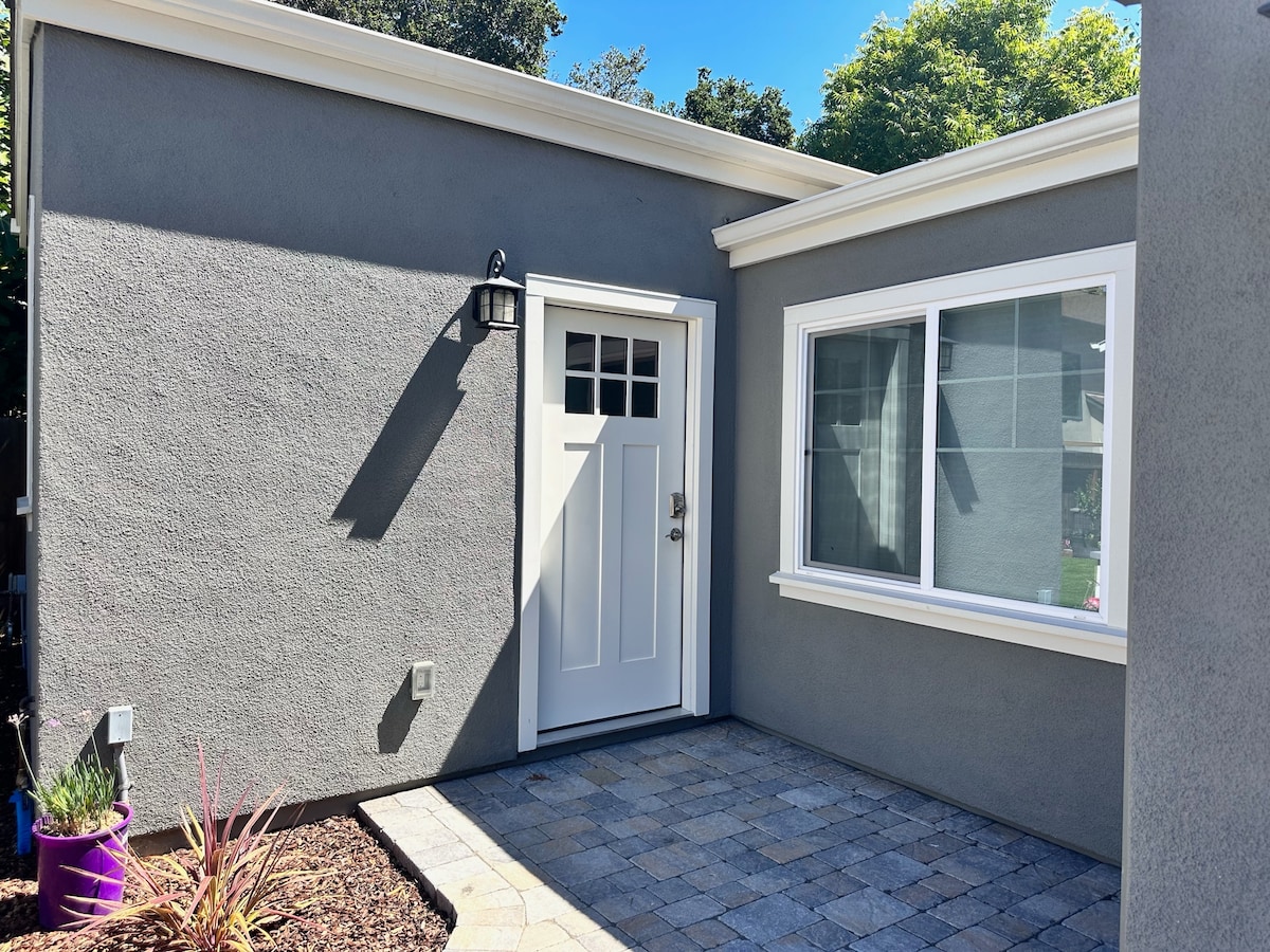 Discover your perfect retreat a block from Stanford University, tucked away on a tranquil, tree-lined street in Palo Alto. Newly constructed, single-level guesthouse offers privacy, set discreetly at the rear of our property. You'll find yourself within a leisurely stroll minutes from restaurants, grocery stores, and shops. Easy access to 101 and 280 fwys. This haven is within walking distance to Caltrain CA Ave station, as well as stops for Stanford's complimentary Marguerite Shuttle service.