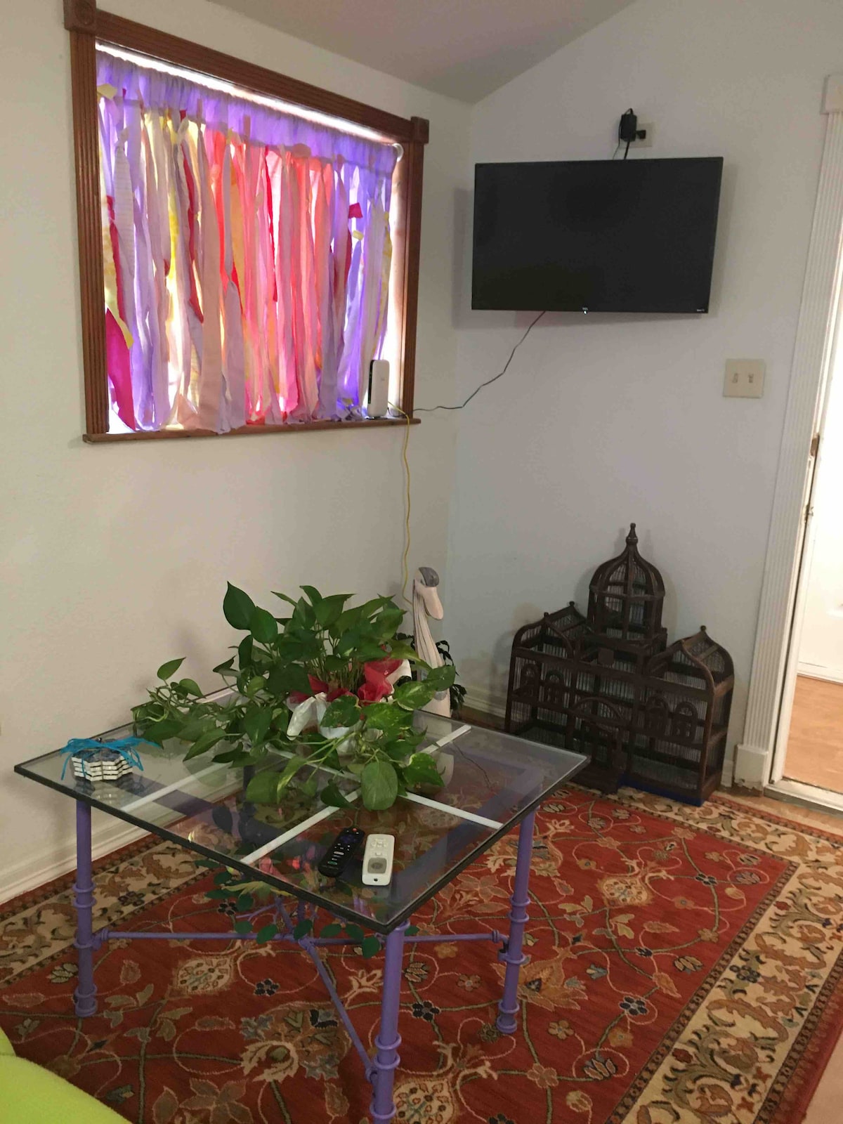 Take it easy or swing into fun at this unique, peaceful get-away in the Palo Pinto Wynn Mountains. The birdcage is surrounded by beautiful trees and features a gorgeous view from the deck. The studio apartment features a queen size bed, kitchen, and living room/tv area all decorated in boho decor. Whether you are staying 2 days or 6 months this one room studio has everything to make you feel right at home. Pool, outdoor kitchen, fire pit, outdoor fireplace, grill and laundry room are shared.