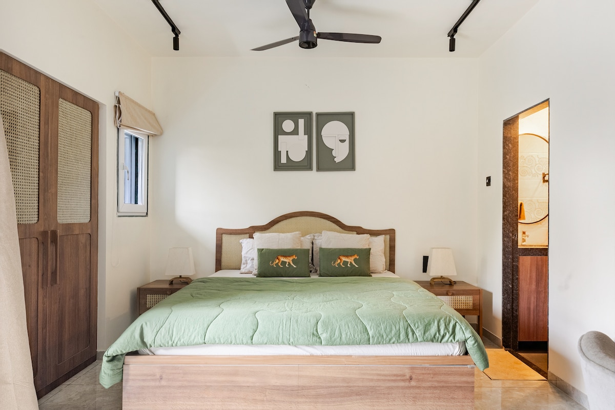 A tranquil and stylish studio apartment nestled in the close Vicinity of Palolem Beach. Designed to provide a serene and harmonious space and thoughtfully furnished to create a cozy and comfortable atmosphere,minimalist yet modern interior features warm accents, sleek furnishings and ample natural light that floods in through large windows offering a bright and airy ambiance throughout. Eutierria boasts a comfortable King-sized bed and fully-equipped kitchenette and a functional workspace