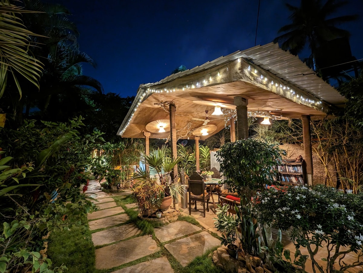 Escape to Red Emerald's jungle-y cottage oasis, just minutes away from South Goa’s popular beaches like Agonda & Butterfly beaches (10min), Palolem (12min), and Patnem (15 min). The cottage is well-equipped with a kitchenette, water purifier, cooktop, and mini-fridge, along with high-speed WiFi and power backup. Food delivery options and free housekeeping services are also available. The lush greenery around the cottage keeps the space naturally cool and perfect for unwinding—no AC needed.