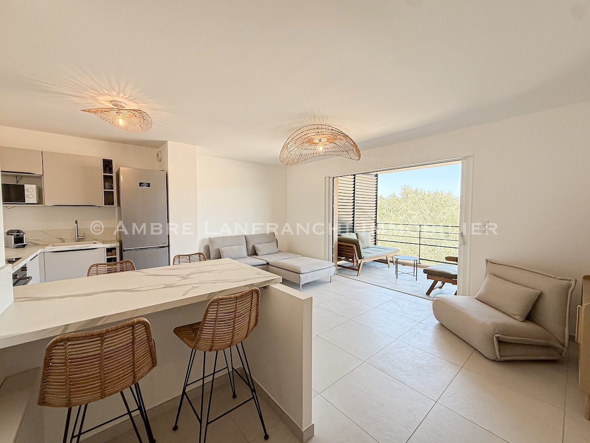 Ce studio, à 10 kms de Porto Vecchio, est dans un petit coin de paradis, les « pieds dans l’eau » dans le domaine privé d’Olmuccio. Une vue incroyable entre mer et montagnes s’offre à vous . Refait à neuf, il dispose de tout le confort moderne : climatisation, smart tv, wifi.. Grace aux 2 kitchenettes extérieure et intérieure toutes équipées vous profiterez par tous les temps de cette incroyable vue. Installez vous sur une des terrasses et admirez la mosaïque des couleurs du ciel et de la mer.
