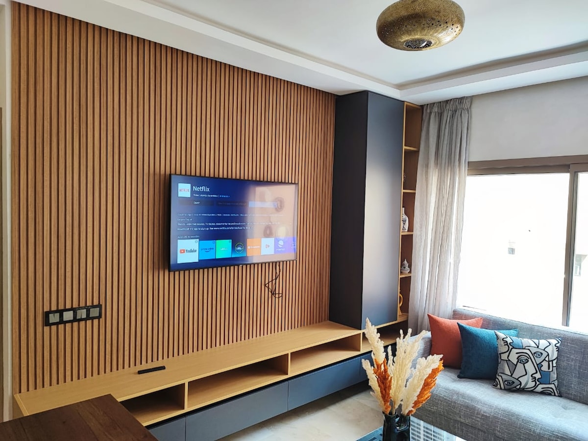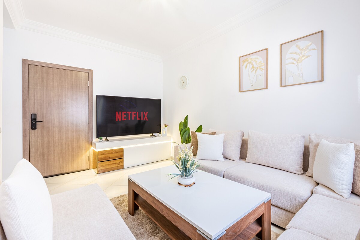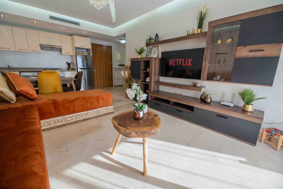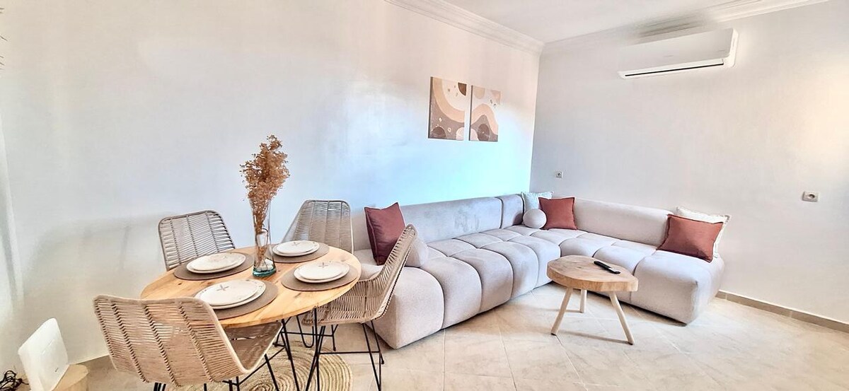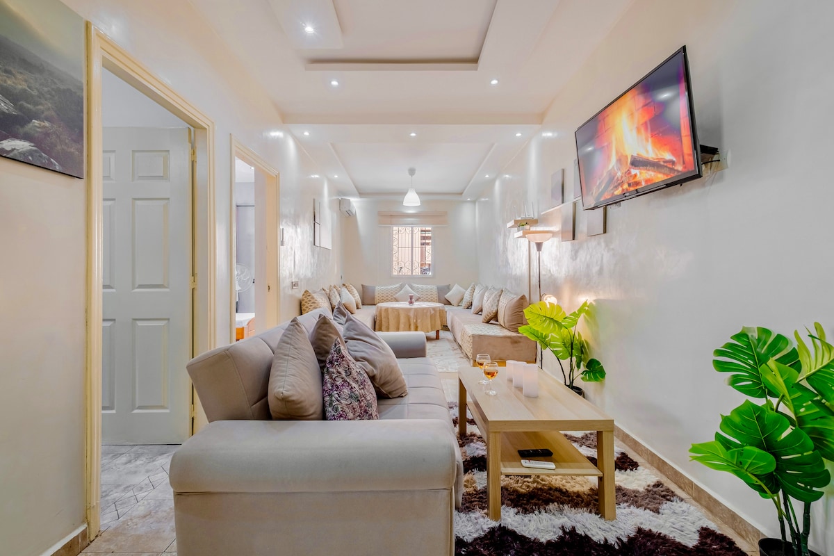 Welcome to your peaceful escape in Marrakech! 🏡 This stylish 2-bedroom smart apartment is a tranquil haven where modern comfort meets the magic of the Red City. 🌅Enjoy mesmerizing sunsets from the balcony. With fast fiber internet, it’s perfect for remote work or streaming 👩💻. 📍Our prime location near Palooza Land gives you easy access to top attractions. It's ideal for solo travelers, couples, or business guests.