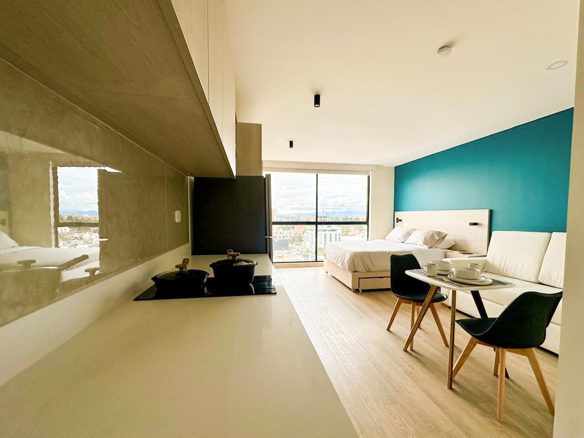 Stunning loft with breathtaking city & mountain views. Indulge in the most luxurious bed in the building, providing a level of comfort akin to a five-star hotel. Plush pillows ensuring the best sleep of your life. Enjoy a 60" TV with Netflix, a well-equipped kitchen, and relax in the easy chair by the window. Hot water shower, Hairdryer, ample closet space, and a perfect work area. Upcoming amenities: rooftop, coworking, gym. Close to Transmilenio station. Book now for an unforgettable stay